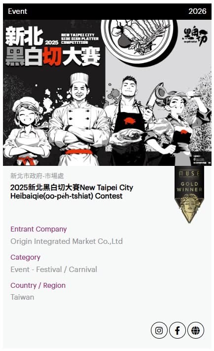 另值得驕傲的是,新北黑白切大賽不僅在國內掀起美食風潮,更成功走向國際。憑藉將傳統飲食文化轉化為現代城市品牌的卓越策劃,2025年第一次舉辦即榮獲國際知名「美國繆思設計獎(MUSE Design Awards)」金獎肯定。這項國際榮譽象徵新北成功將傳統小吃轉化為具備國際質感的城市品牌,也讓世界看見新北獨特的「黑白切」飲食美學!